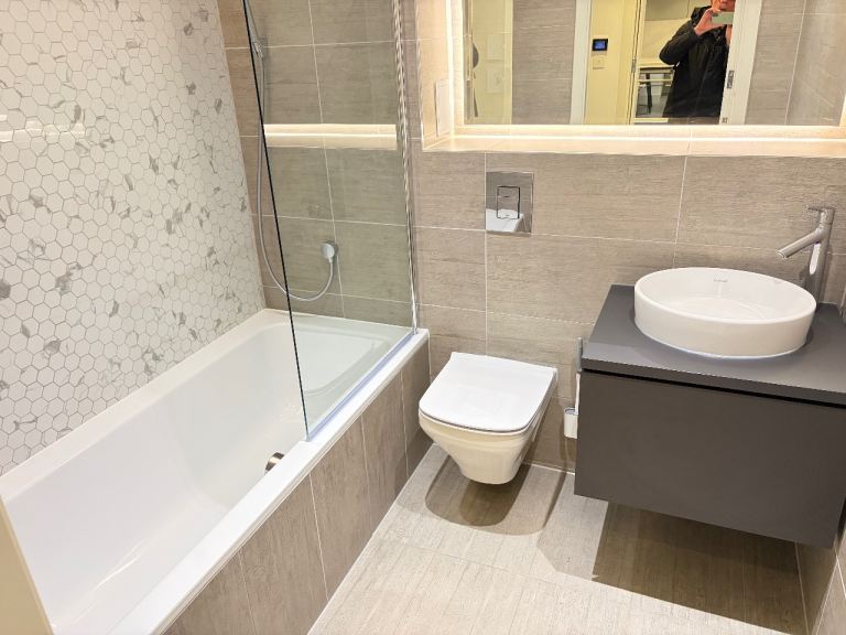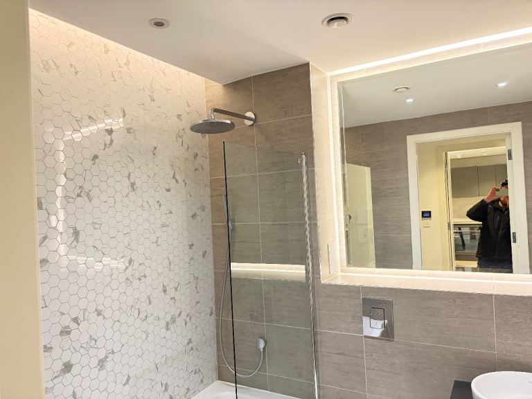 Separate Ceramic Floor and Wall Tiled Full Bathroom Suite, Rain Shower and Hand Shower, Basin Mixer Taps, Vanity Storage Unit, Heated Towel Rail, Shaver Points, Light Up Mirror
