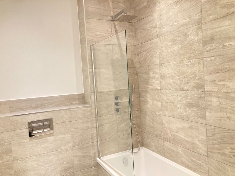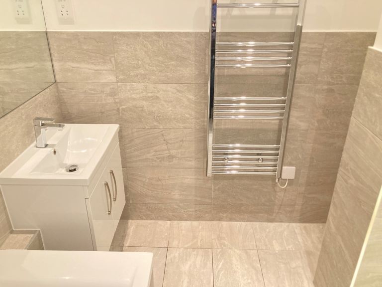 Large Full Bathroom Suite with Bath, Rain Shower, Hand Shower, Basin Mixer Taps, Low Level WC, Heated Towel Rail, Power Points, Large Mirror