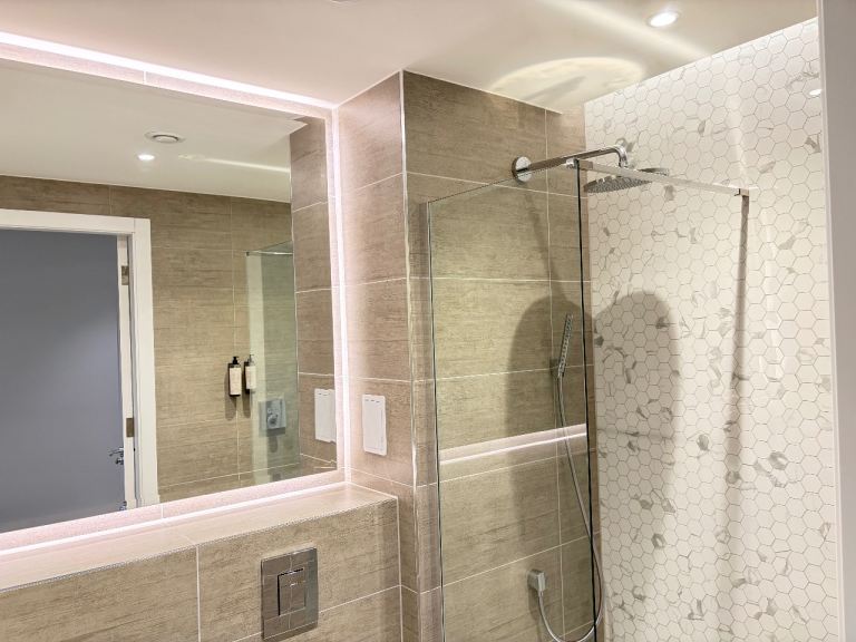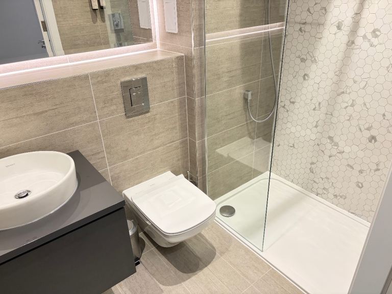 Separate Ceramic Floor and Wall Tiled Full Shower Room Suite with Rain Shower and Hand Shower, Basin Mixer Taps, Vanity Storage Unit, Heated Towel Rail, Power Points, Light Up Mirror