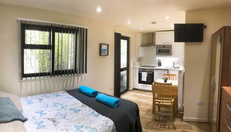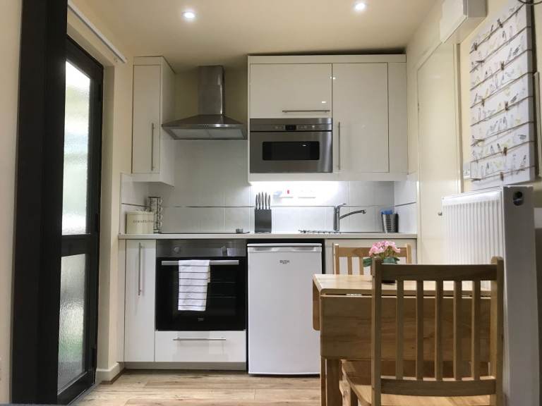 The studio was recently refurbished, has wooden floors, double glazed, pressure shower & own toilet, new modern kitchen with all appliances including pots and pans, cutlery, kettle, iron and ironing board and fresh linen.