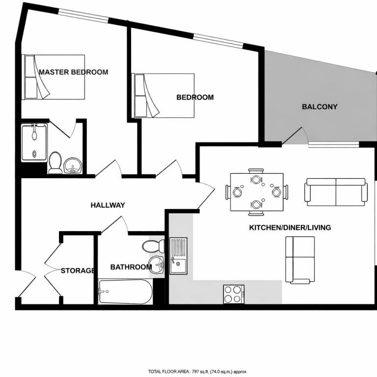 The apartment offers a spacious open-plan kitchen and living area measuring 6.77m x 4.6m, creating a bright and contemporary living space. Both bedrooms are generous doubles. The master bedroom measures 3.90m x 3.57m and benefits from a private en-suite bathroom (1.58m x 2.4m). The second bedroom measures 4.69m x 2.97m. There is also a separate shared family bathroom.