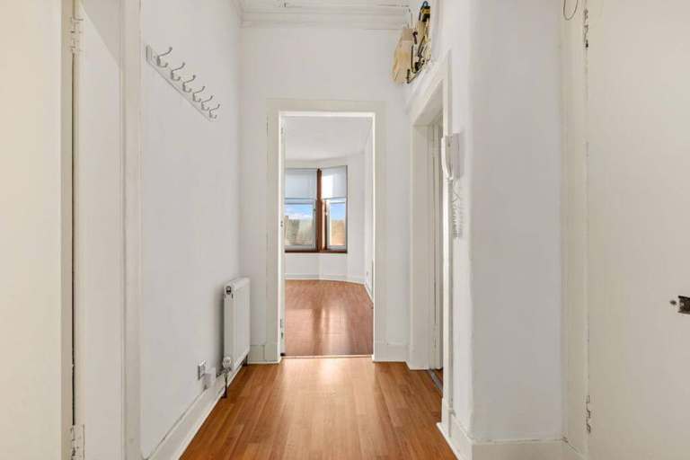 Upon entering, you are greeted by a welcoming hallway leading to all rooms within the flat: