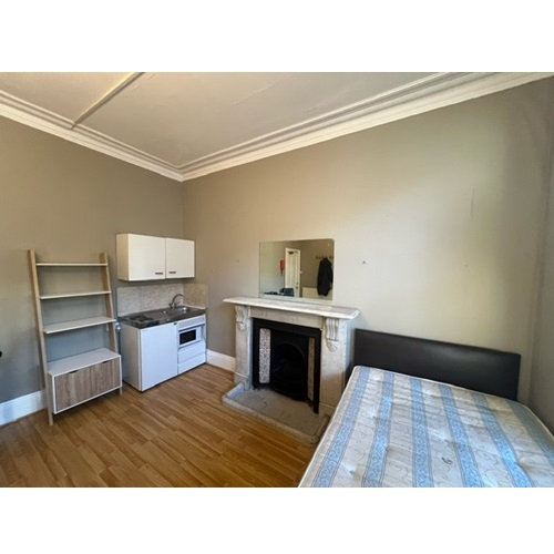 A spacious studio room with two large original sash windows overlooking a private balcony, original ornate fireplace, high ceilings with ornate cornice. Furnished with a double sofa-bed, coffee table, dining table and chairs, double bed.
