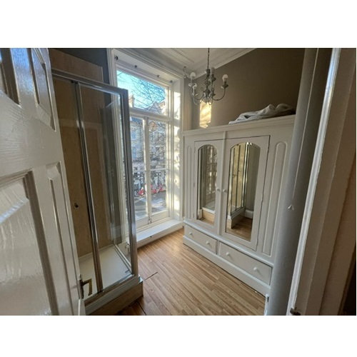 Separate small dressing room with two double wardrobes and chest of drawers and a shower. Large French doors leading directly onto a private balcony with original ornate cast iron railings.