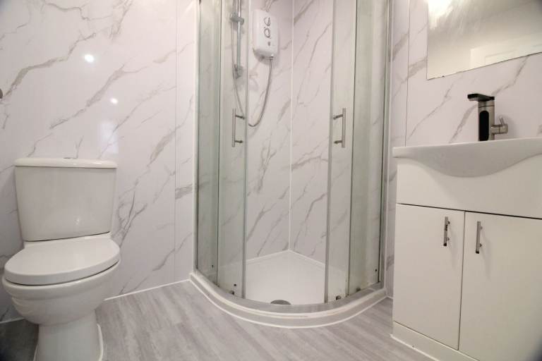 -The bathroom suite is modern and has a walk in shower, WC and sink