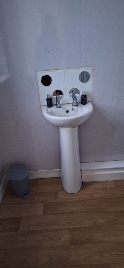 Kitchen and bathrooms both lino and white with white glitter wallboards in both.