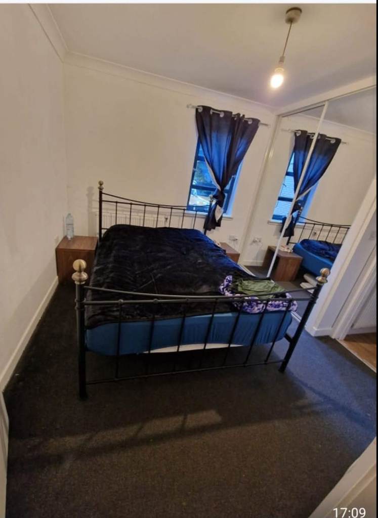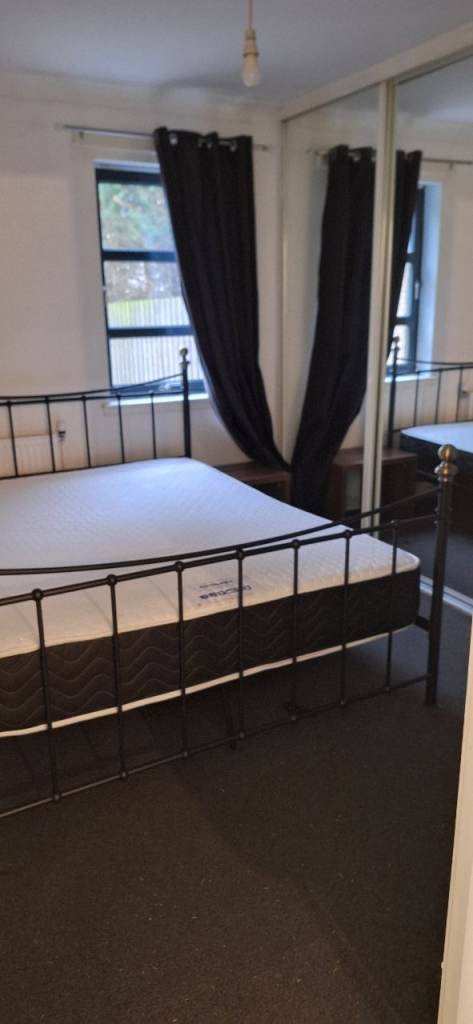 This spacious large ground floor flat, 2 double bedrooms both with sliding doors build in large wardrobes. Black carpets. Both have double beds with mattresses. And bedsides cabinets etc