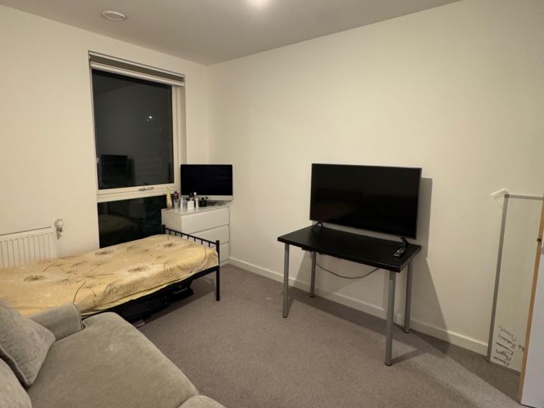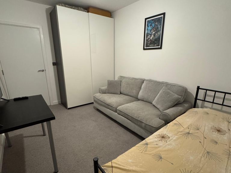 The room is available to rent immediately and comes fully furnished, providing a comfortable private living space. It includes a single bed, sofa, TV, coffee table, chest of drawers, and wardrobe, making it ideal for a single professional.
