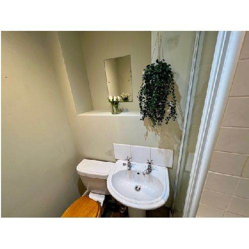 Separate bathroom with a shower, hand basin and WC.
