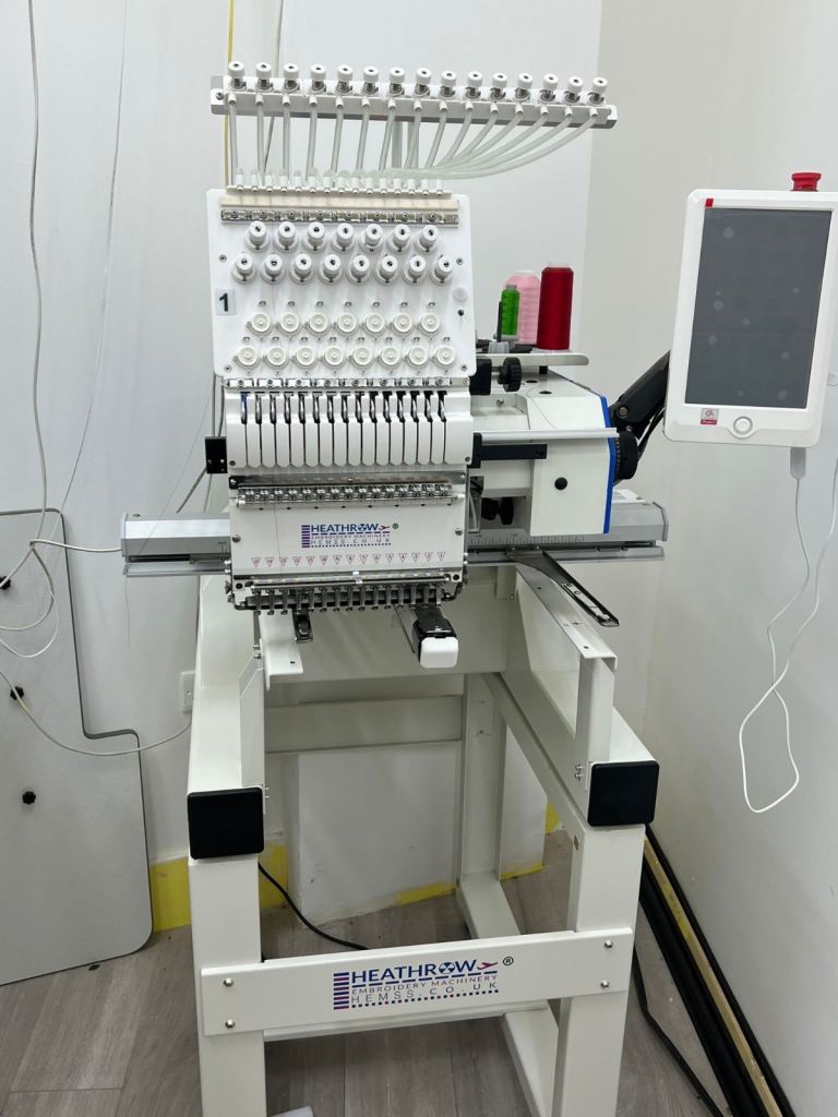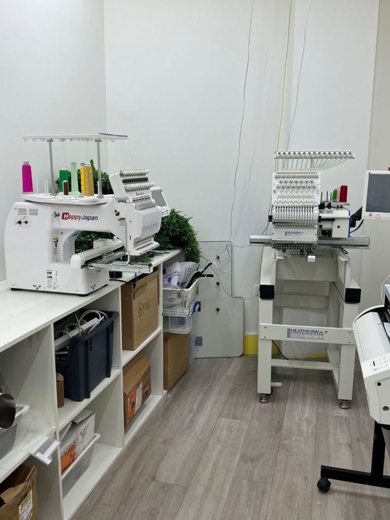 The shop currently contains professional printing and embroidery equipment (DTF, vinyl, embroidery machines, cutters, heat press etc.).