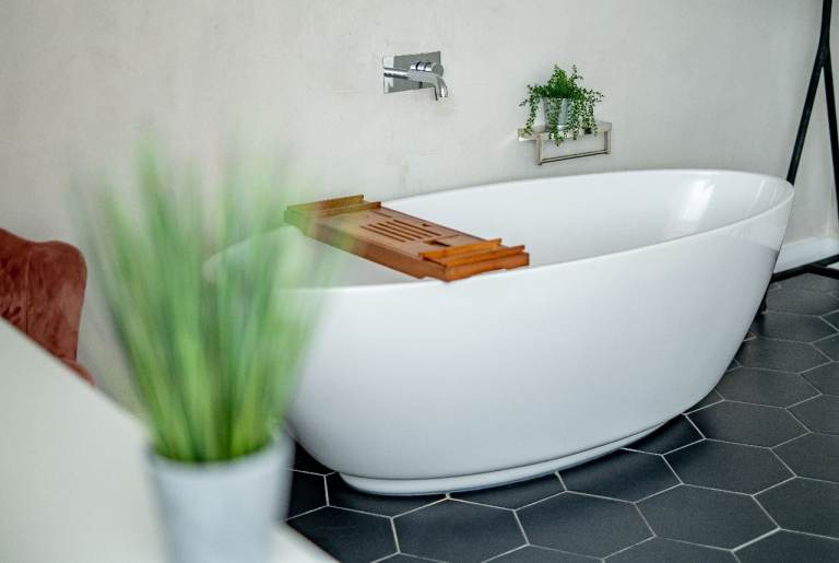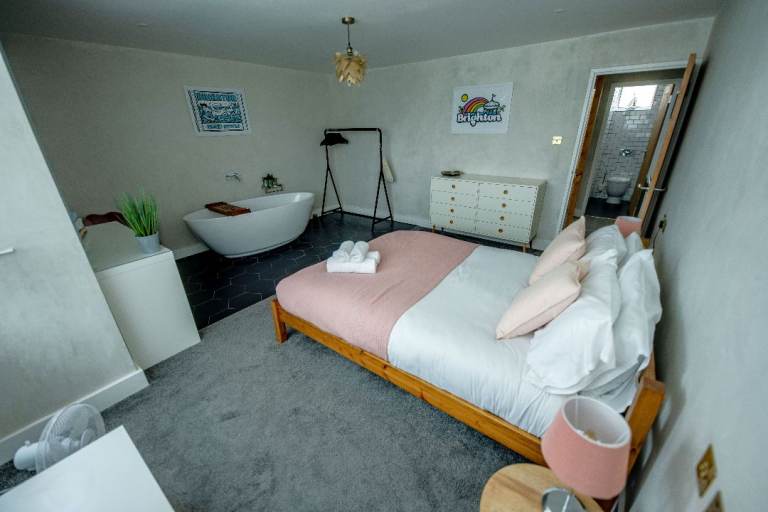 Bedroom 1: A large main bedroom with a king-size bed and freestanding bath, providing a relaxing and spacious retreat.