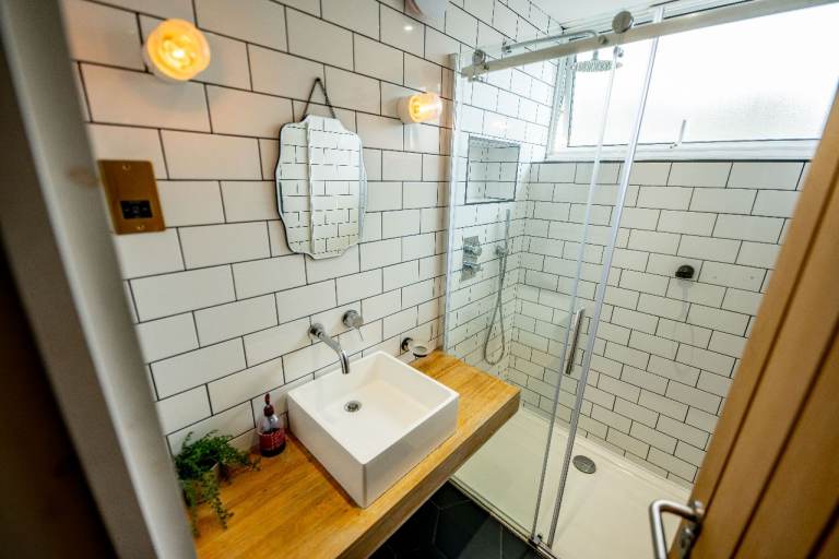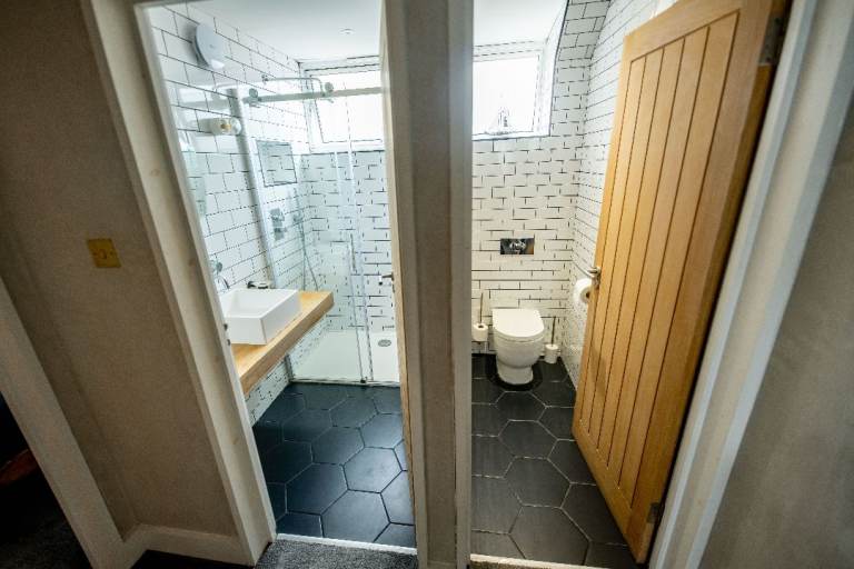 The upper floor also includes a walk-in shower and a separate toilet for convenience.