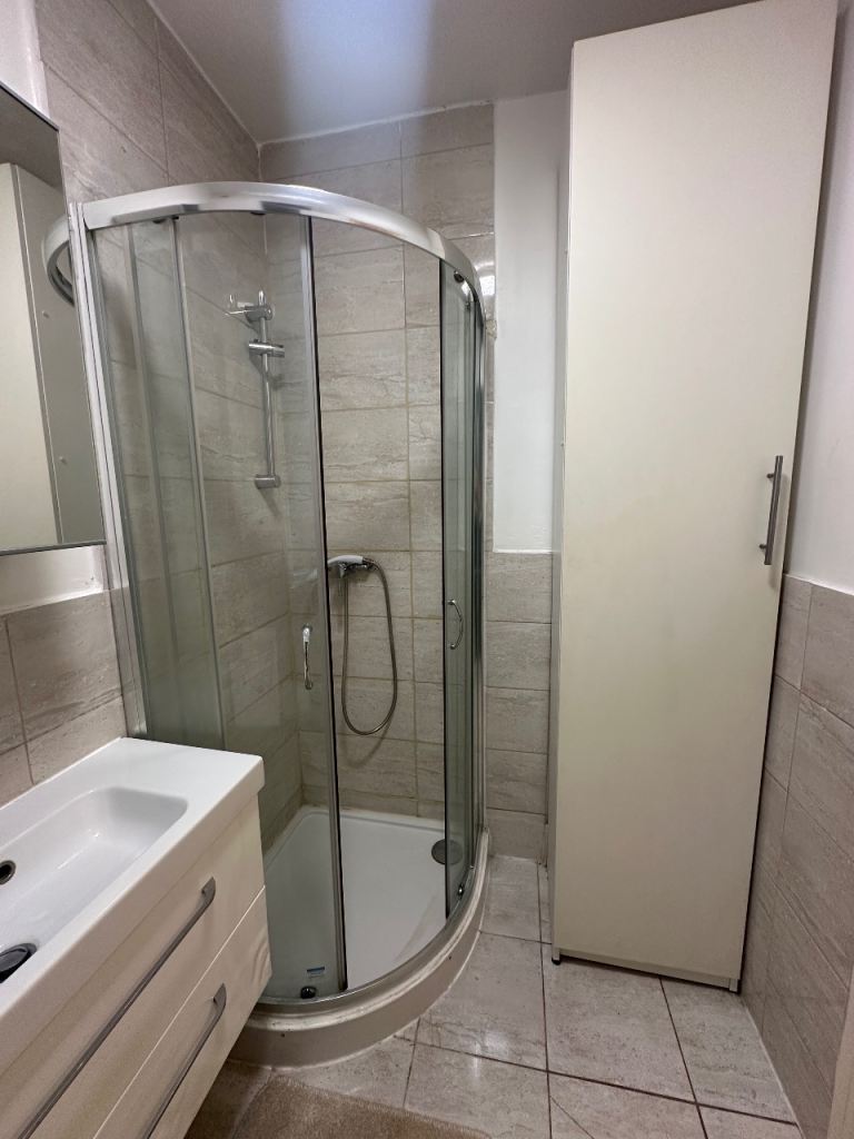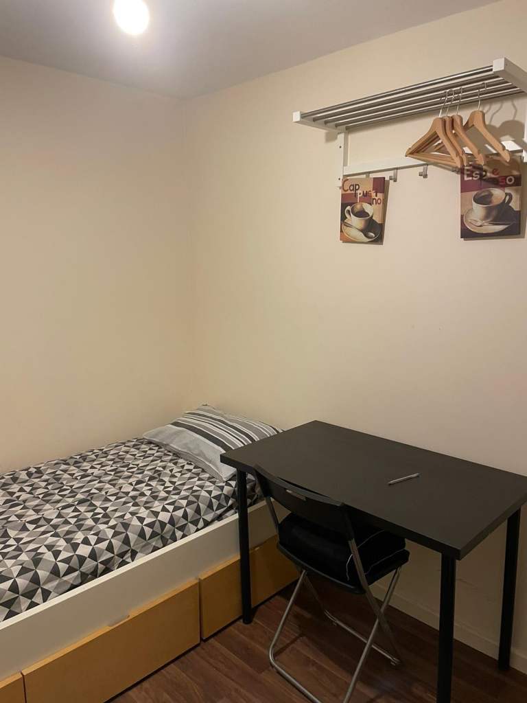The studio benefits from an Ikea single bed with storage underneath and Ikea mattress. Small kitchenette to include ceramic hob, wash basin, fridge/freezer and dining table with chair.