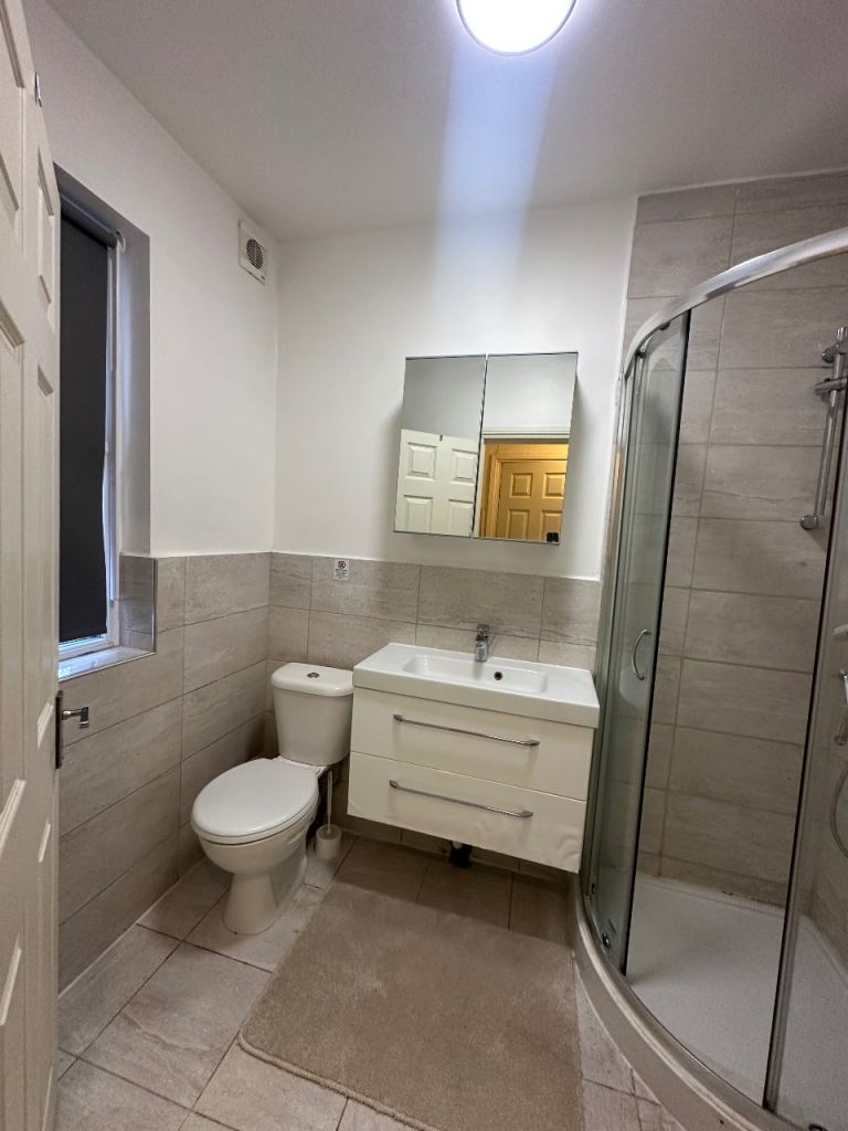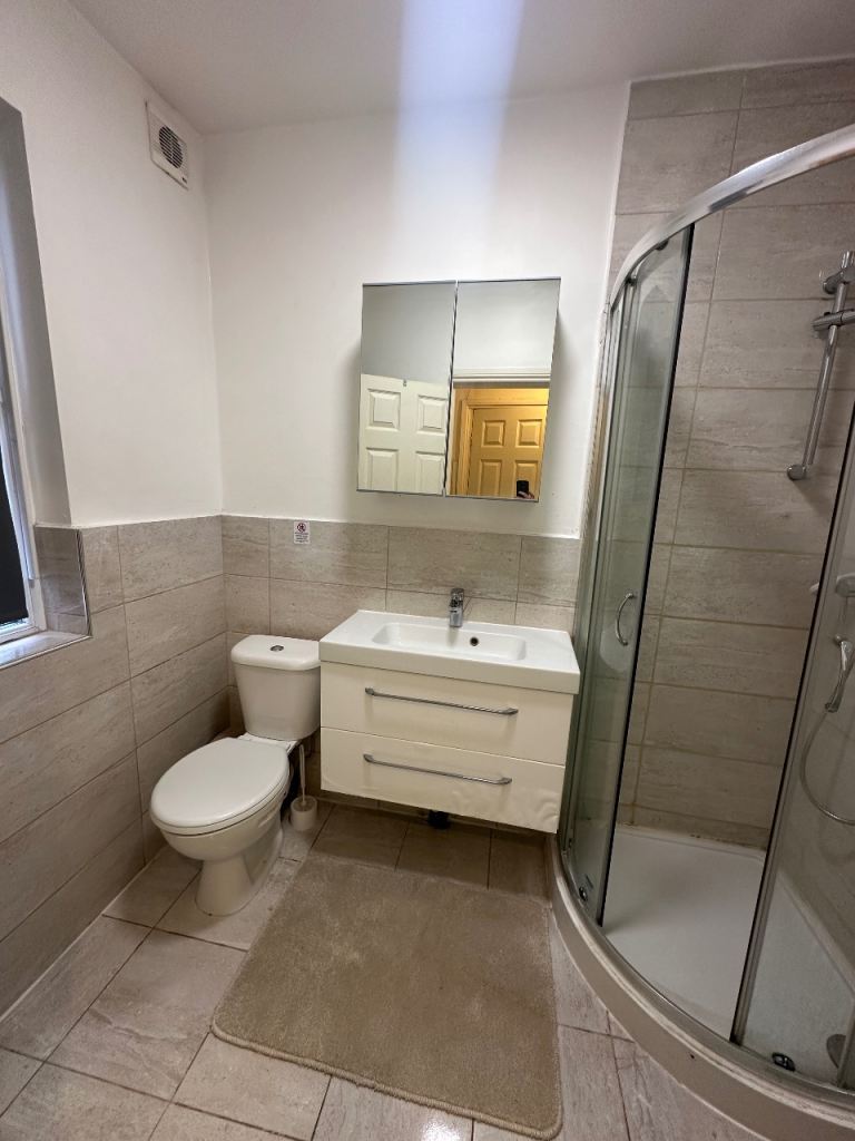Separate bathroom with quadrant shower enclosure, vanity wash unit with drawers, mirror wall cabinet and a tall Ilea bathroom storage unit.