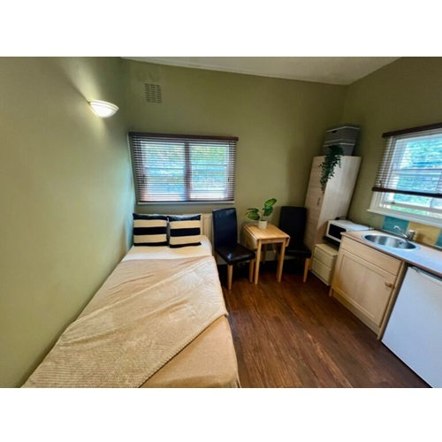 Fully furnished with a bed, wardrobe, chest of drawers, shelving, dining table and chairs.