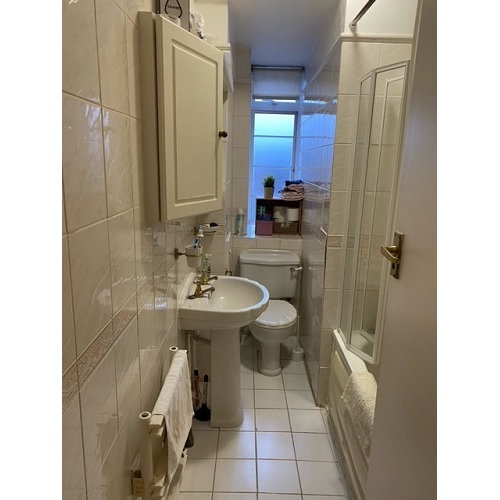 Separate bathroom with a bath with a newly fitted overhead power shower, WC & wash-basin.