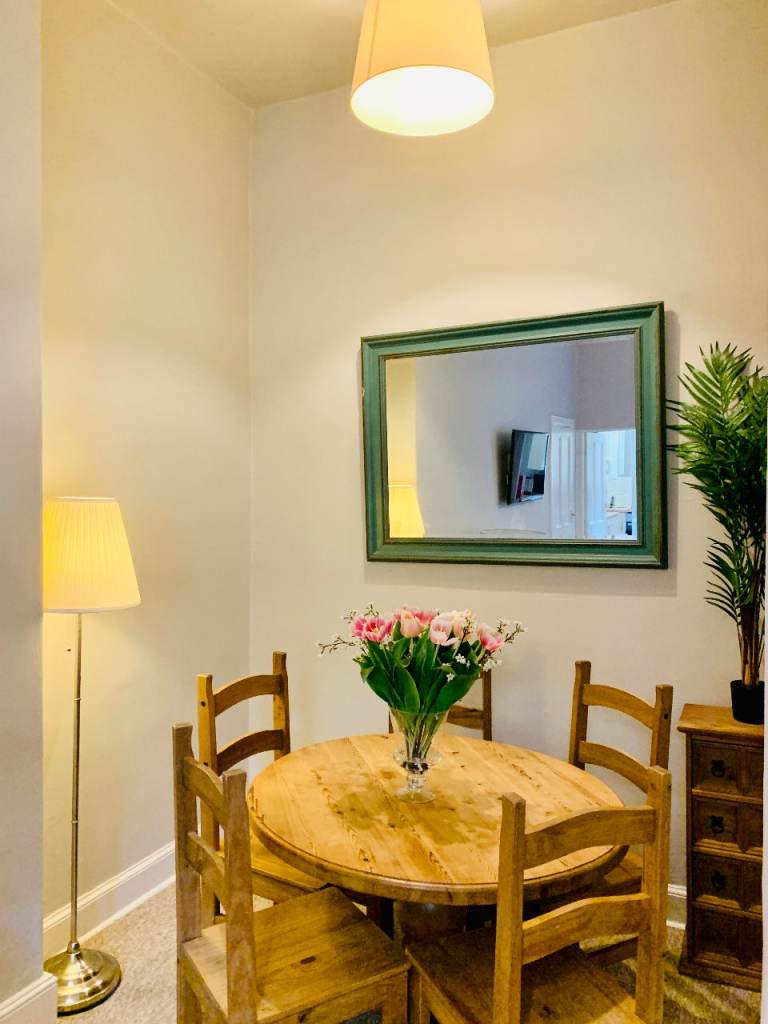 The apartment has a large comfortable sitting room with comfy sofas, wall mounted smart TV, DVD, a dining alcove that can sit up to 6. Off the sitting room, is a modern, fully equipped galley kitchen electric cooker and gas hob, microwave and fridge/freezer.