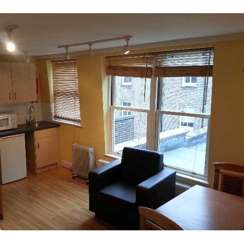 Light and spacious studio room with three sash windows plus a Velux skylight providing lots of natural light and ample ventilation, wooden floors and neutral decor.