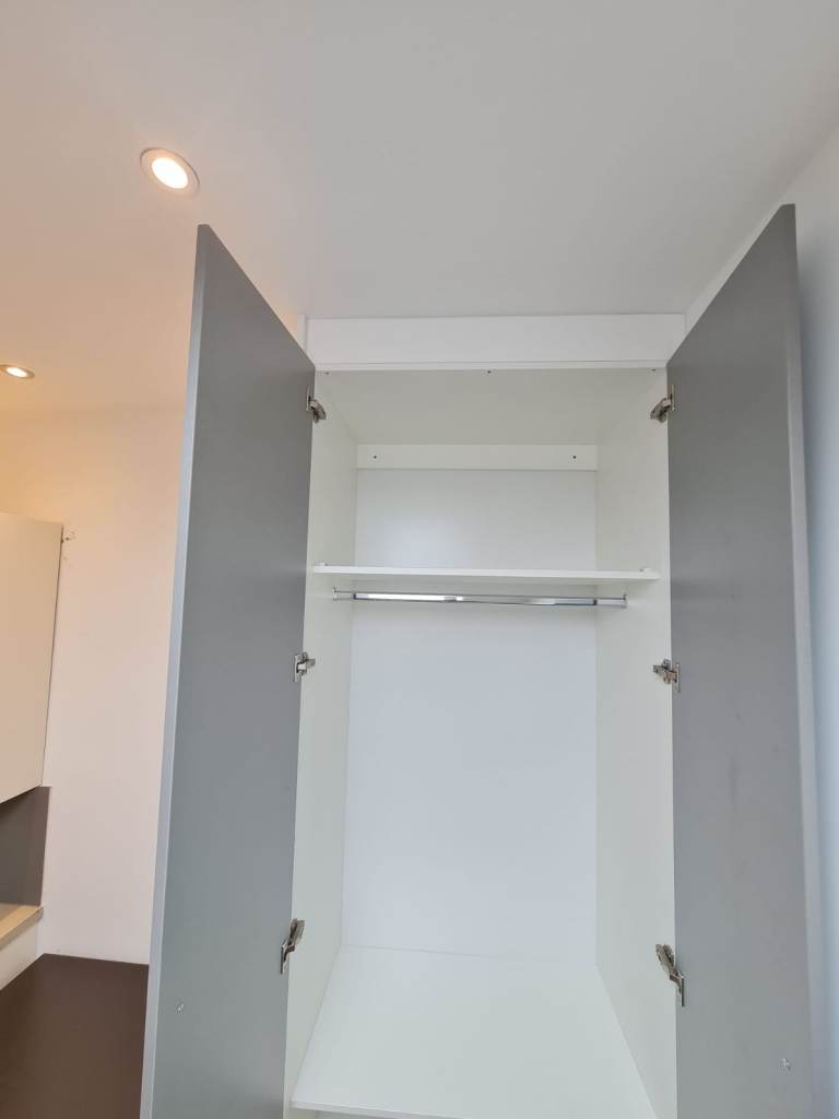 Fitted wardrobe with hanging rail and shelves.