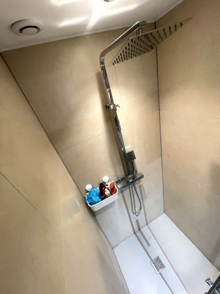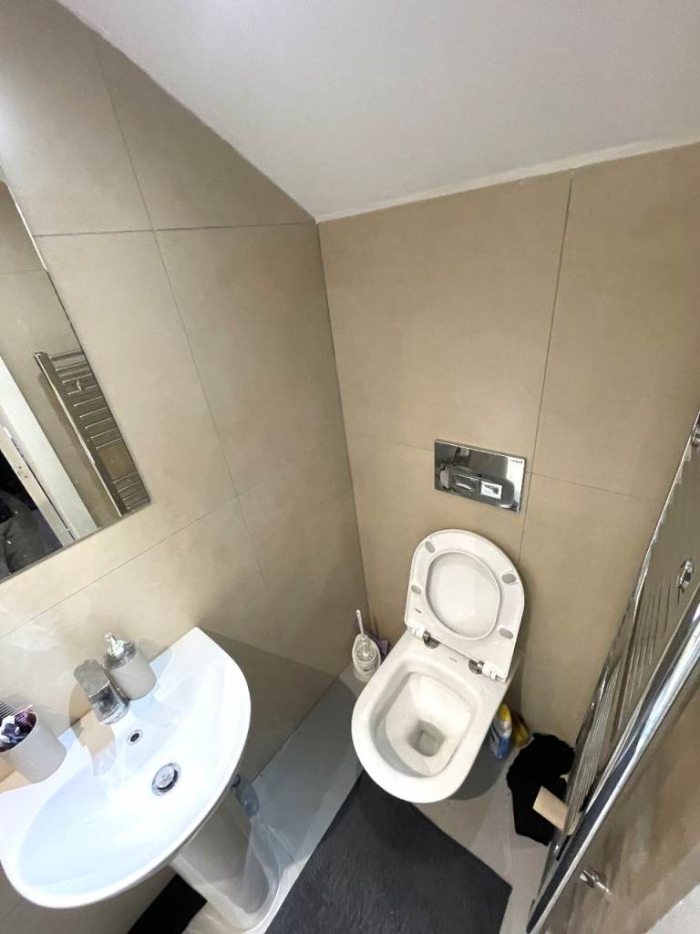 Fully equipped with brand-new sanitary ware, including a sink, toilet, towel rail, and shower.
