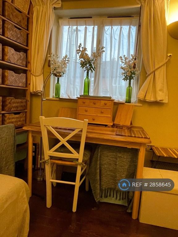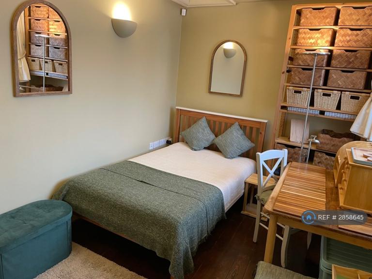 The main room of the Studio has a comfortable bed, a table and chair (facing the window overlooking the Garden), shelves, storage furniture, a reading lamp, a cupboard with full-length mirror, and a Bosch washing machine.
