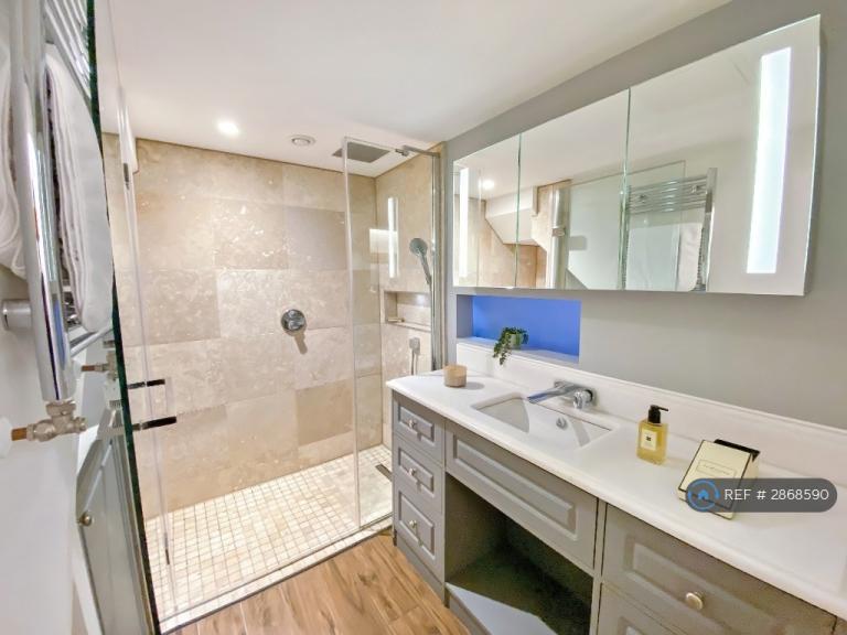 * Modern shower room with marble vanity, heated towel rail, and illuminated mirror.