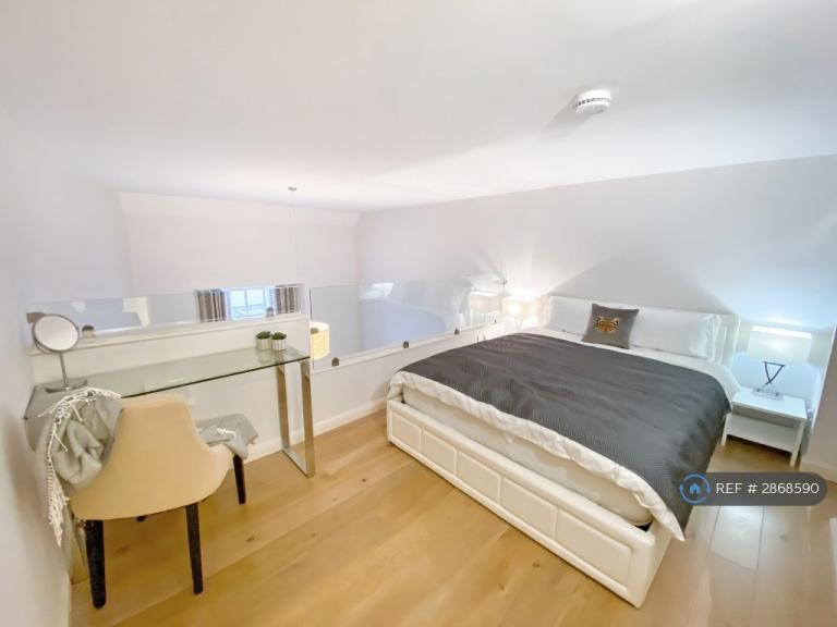 * Mezzanine bedroom with double bed, storage, and desk.