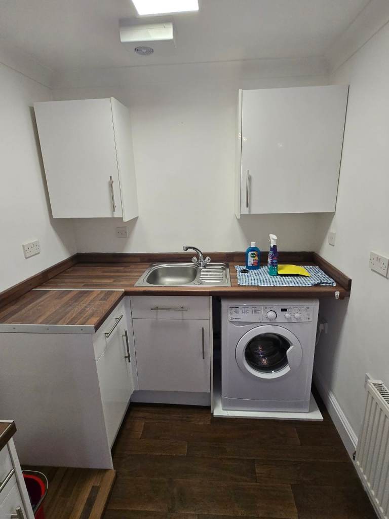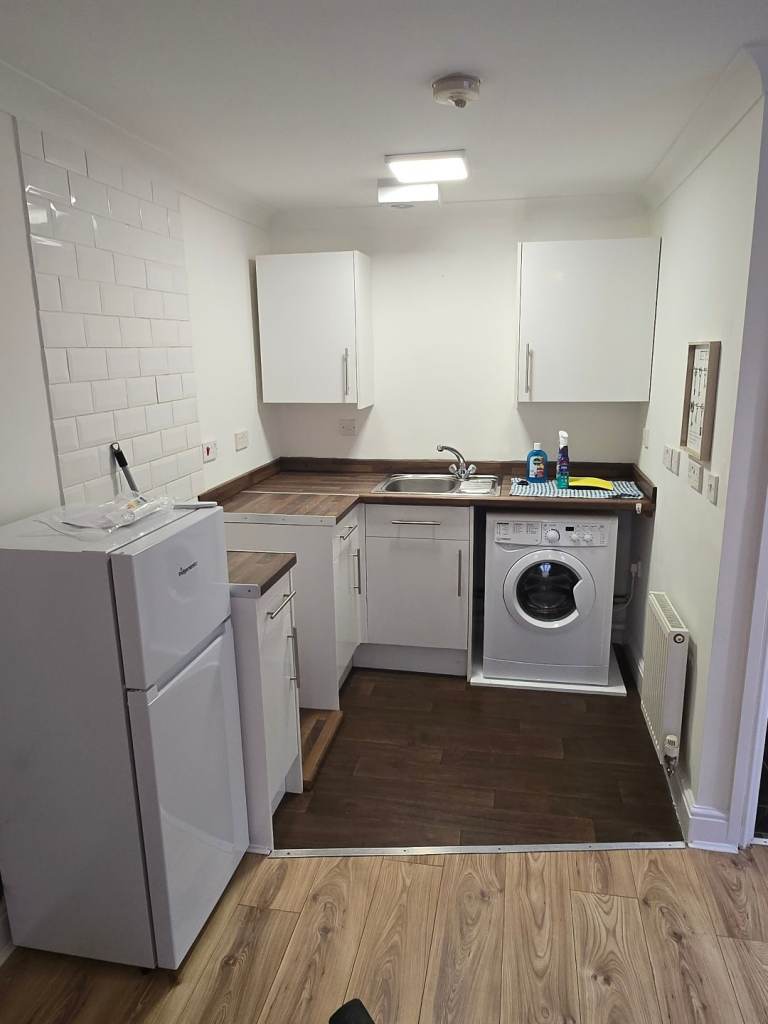 studio flat . Ground floor with own entrance lounge area . Kitchen .. shower room . With separate sleeping area above . Newly redecorated . Laminate flooring Gas c/h . Unfurnished except f/freezer, w/machine and gas cooker installed . Own small garden area . Excellent condition. Available now . Deposit required .gas/electric/water/council tax not included . £695 pcm . Epc C