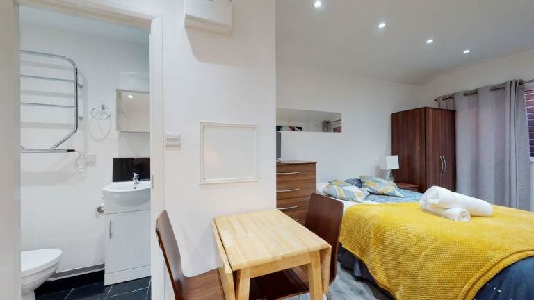 - This studio has an ensuite bathroom with a shower