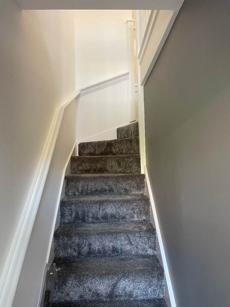 Entrance Door leading to stairs with Grey Carpet flooring Leading to
