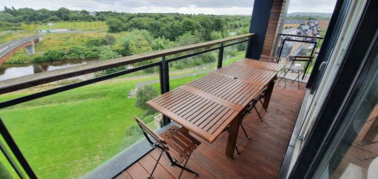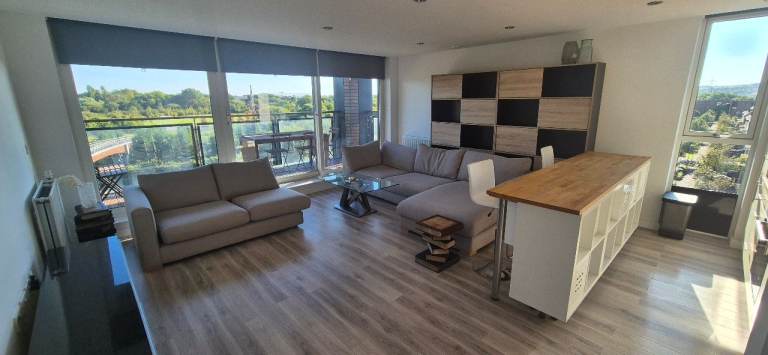 Contemporary fully furnished 2 bedroom flat with master en-suite. The apartment with stunning ceiling for floor panoramic view overs looking the river Clyde and Cunningar Loop woodland park.