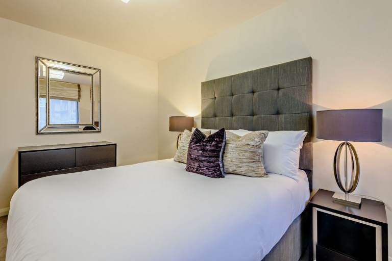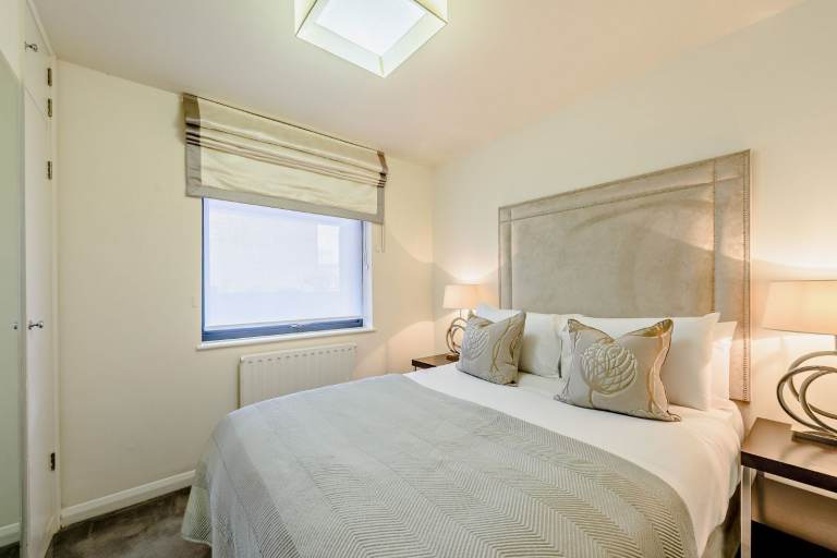 The apartment consists of large reception room and bright modern kitchen with fully integrated appliances. Large windows running along one side of the reception room give the room a fantastic sense of openness and space. It boasts two well-appointed double bedrooms, each thoughtfully furnished with plush beds, stylish headboards, bedside tables, and ambient lighting for a cozy atmosphere. Both rooms offer ample storage and a tranquil environment, ideal for rest and relaxation.