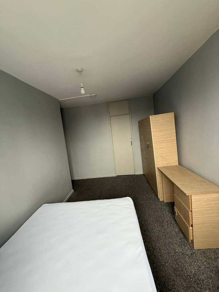 The room includes a comfortable double bed, wardrobe, and ample storage. The communal areas — kitchen and bathroom — are kept to a very good standard.
