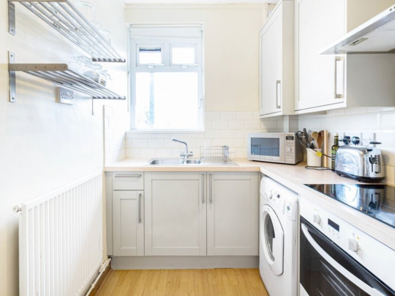 Spacious living room with dining table and chairs. Fully equipped kitchen including washing machine, fridge, storage cupboards and dryer. Bathroom with full bath and show