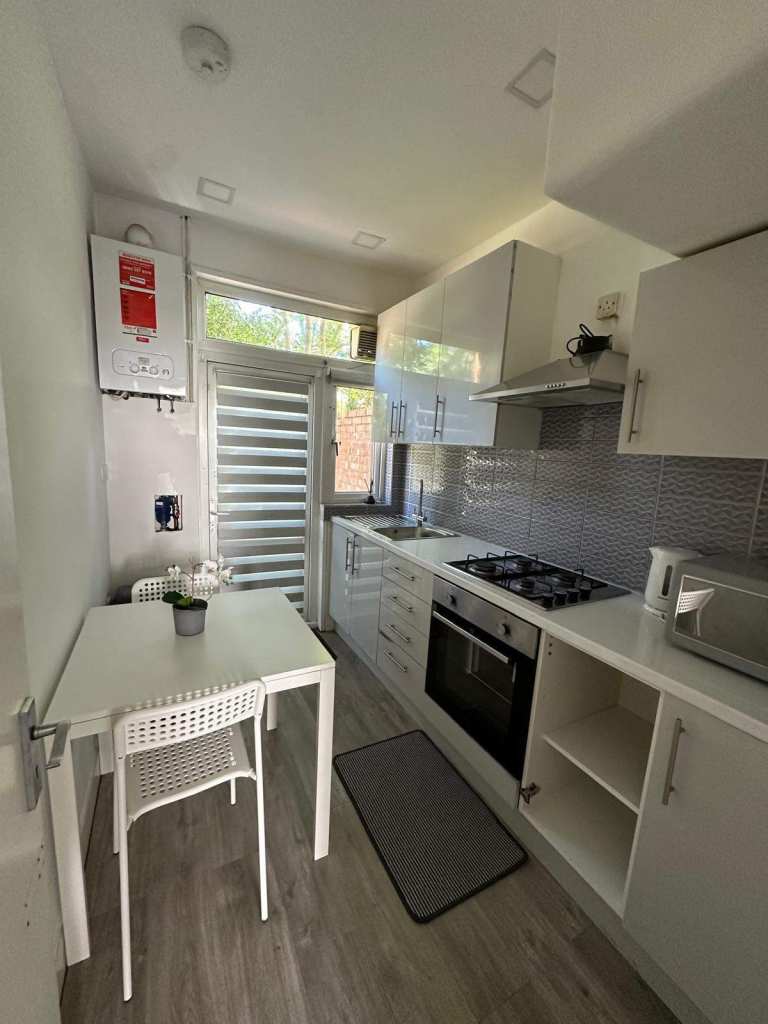 🔸Spacious living room with dining table and chairs. Fully equipped kitchen including washing machine, fridge, storage cupboards and dryer. Bathroom with full bath and shower.