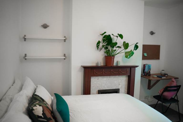 The room includes a comfortable double bed, wardrobe, and ample storage. The communal areas — kitchen and bathroom — are kept to a very good standard.