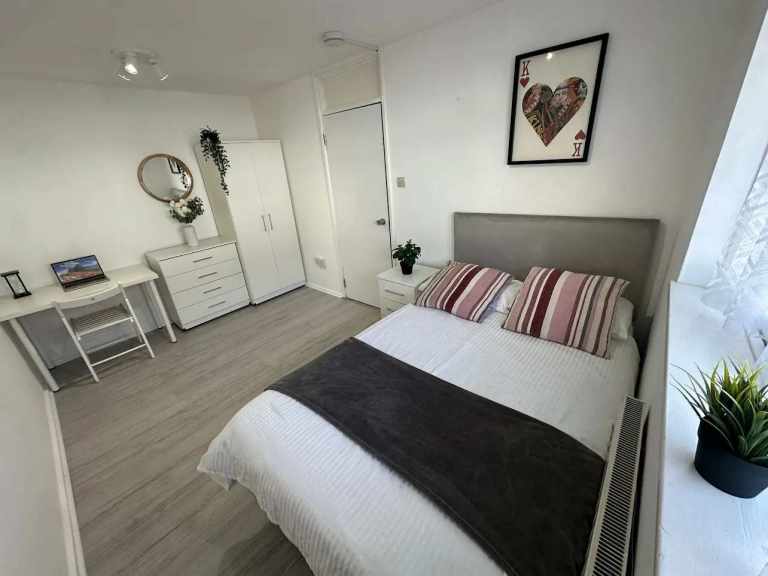 A well-presented double room is now available in a fully furnished flat in Mile End. The room features a double bed, built-in storage, and plenty of natural light.