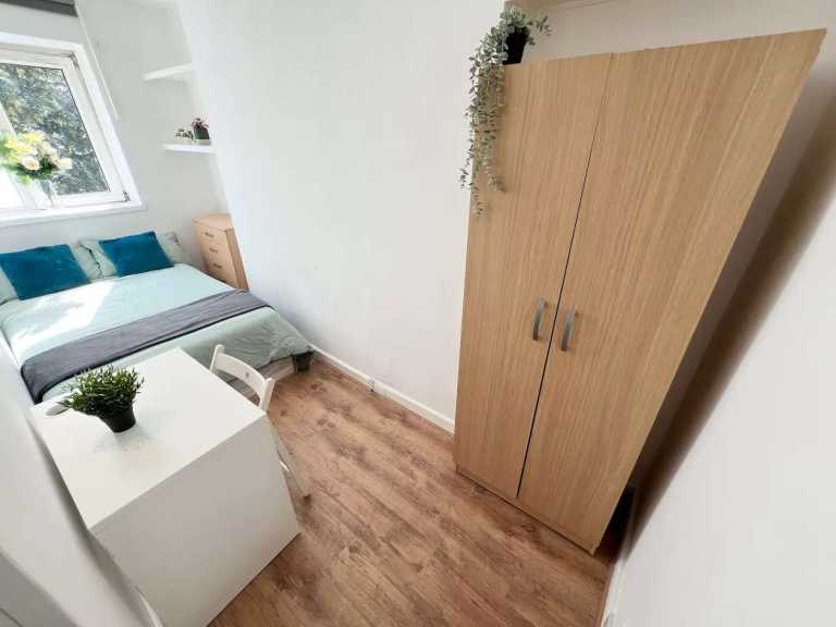 Spacious double room to rent in a well-kept shared flat in Whitechapel. The room comes fully furnished with a double bed, wardrobe, desk, and good natural light throughout.