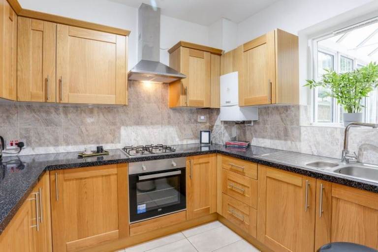 Modern 5-bed professional house share. Two bathrooms plus extra WC – shared between just 4 people. Features a huge garden, conservatory, utility room, and well-equipped kitchen with washing machine and dishwasher. Large TV in living area.