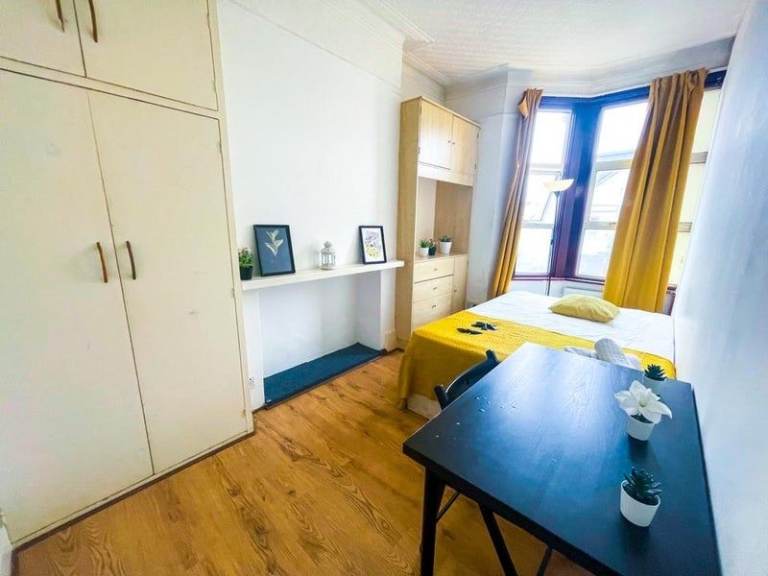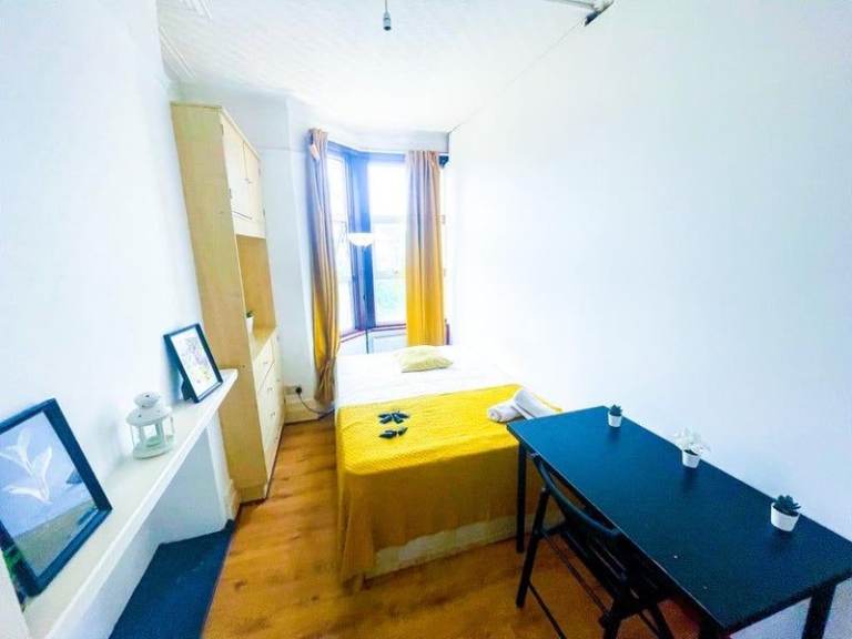 A cozy single room available now. Comes fully furnished with a comfortable bed, wardrobe, chest of drawers, large windows, and heating – just move in and settle.