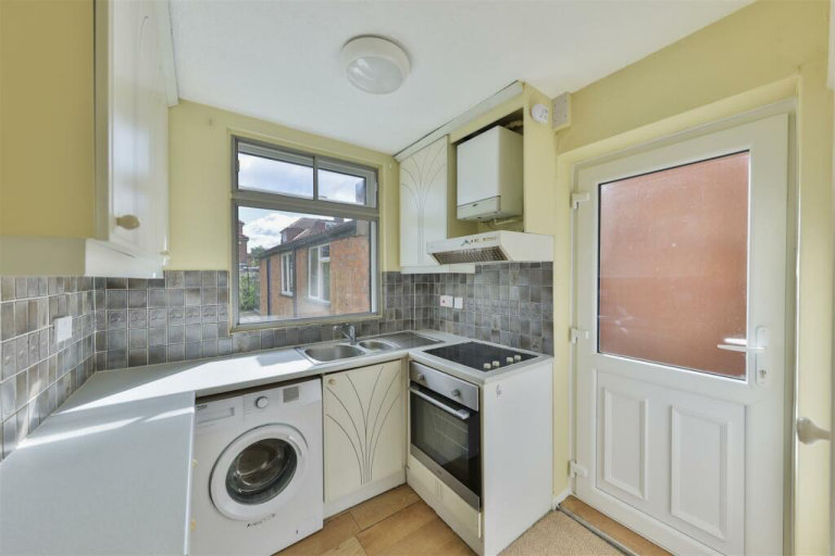 🔹 Fully equipped kitchen with washing machine, fridge, ample storage, and dryer