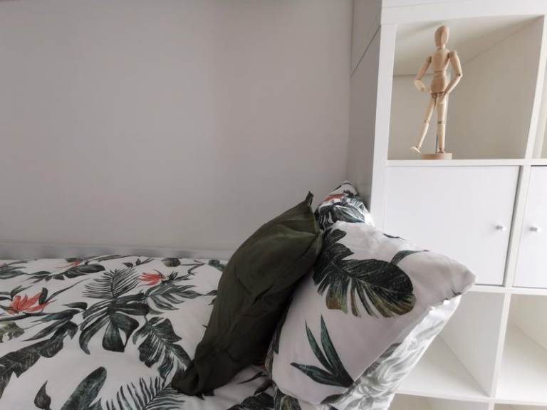 Room features: double bed, wardrobe, storage space, and natural light. The kitchen is fully equipped and the bathroom is well-maintained.
