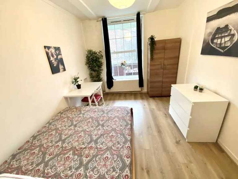 This spacious double room is available to rent in a well-kept shared flat in Poplar. The room comes fully furnished with a double bed, wardrobe, desk and benefits from good natural light throughout.