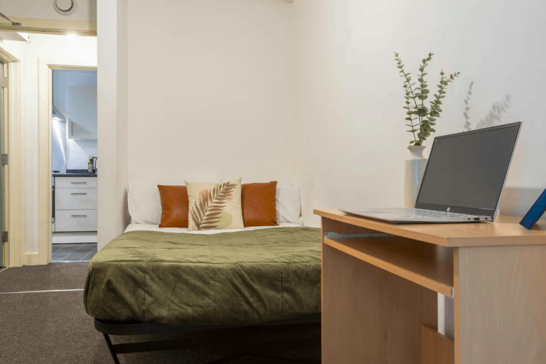 Our Bronze Non Ensuite is a compact bedroom that features a small double bed, wardrobe, study desk and chair. Set within a 3 bedroom apartment in Manchester, you'd share the toilet/shower-room, kitchen and balcony.