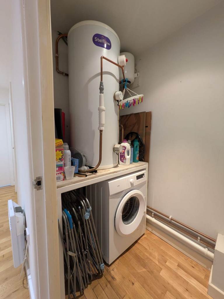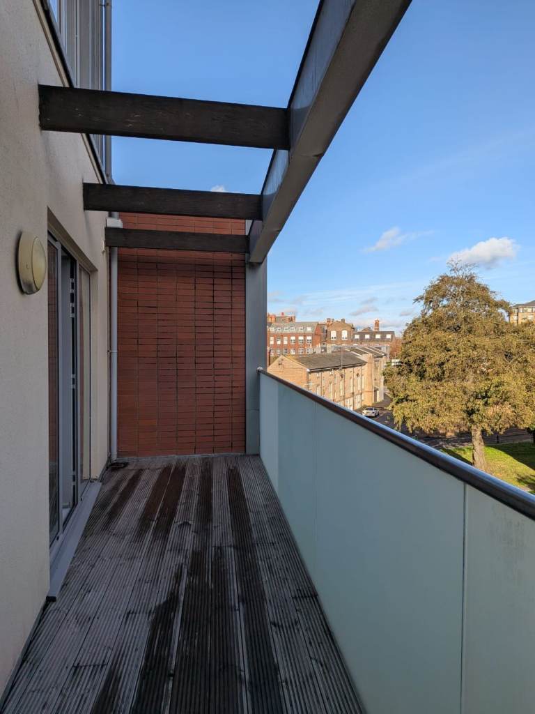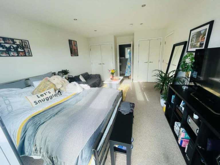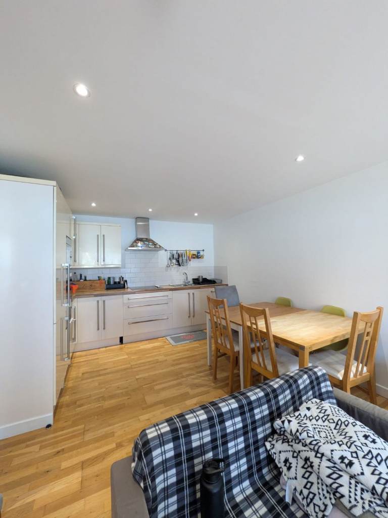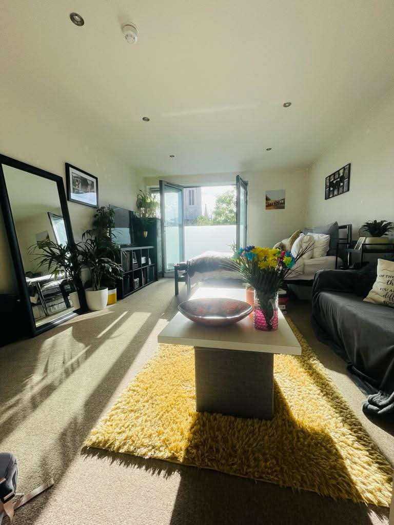 The apartment has an open-plan kitchen and lounge that opens onto a balcony. It has a washing machine (no dryer), double-glazed windows, and stays warm in winter. Bills for electricity, water, internet, and council tax are split evenly each month.