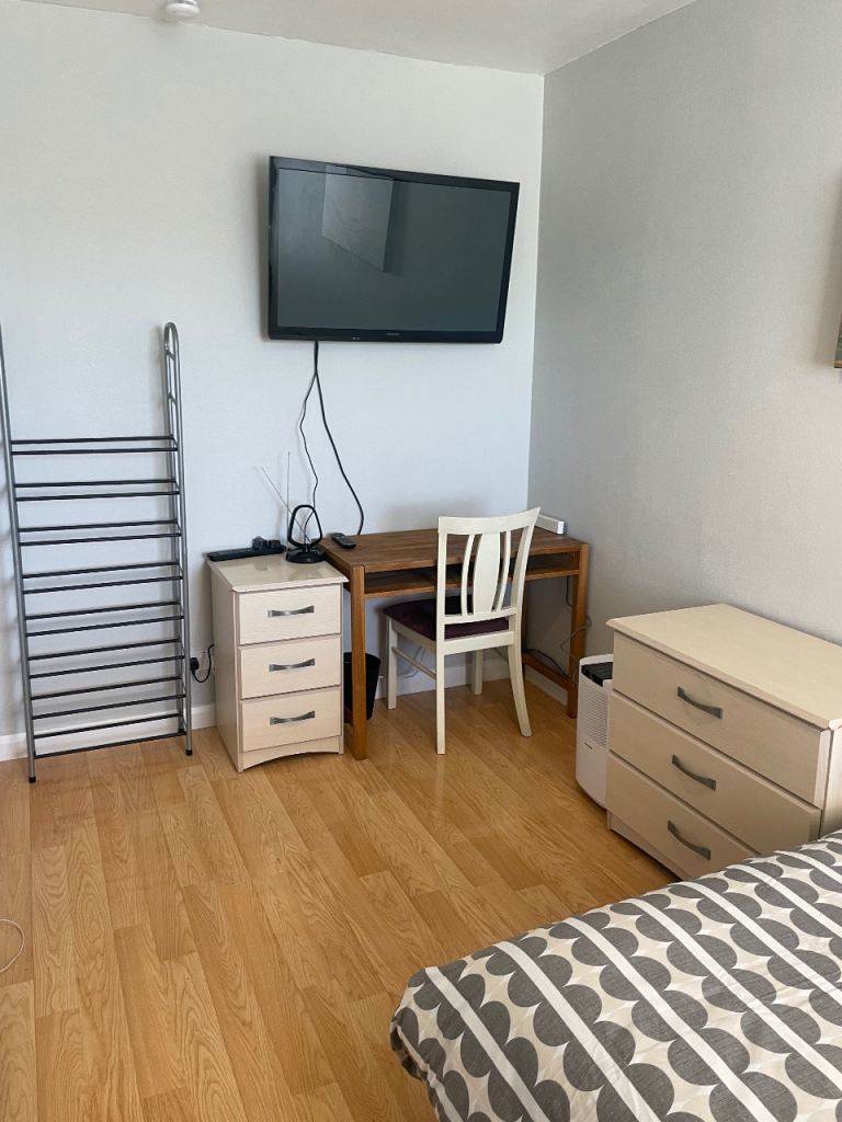 The bedroom is a warm room with a double bed, wardrobe, drawers and study desk and TV.