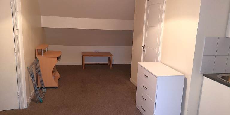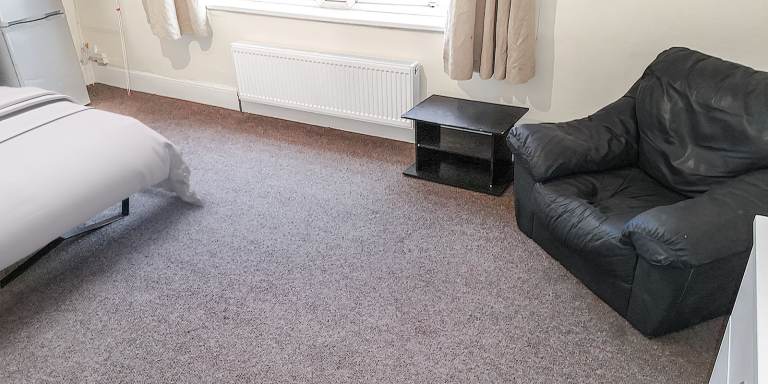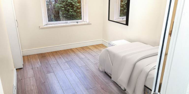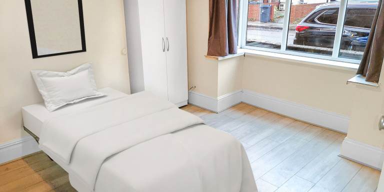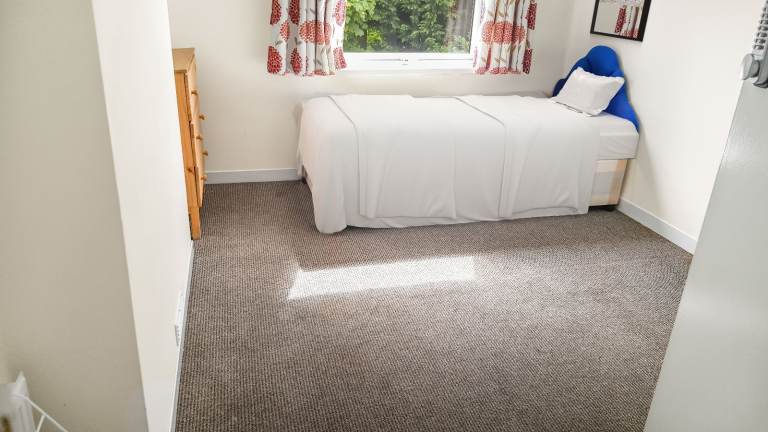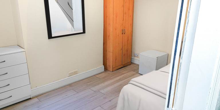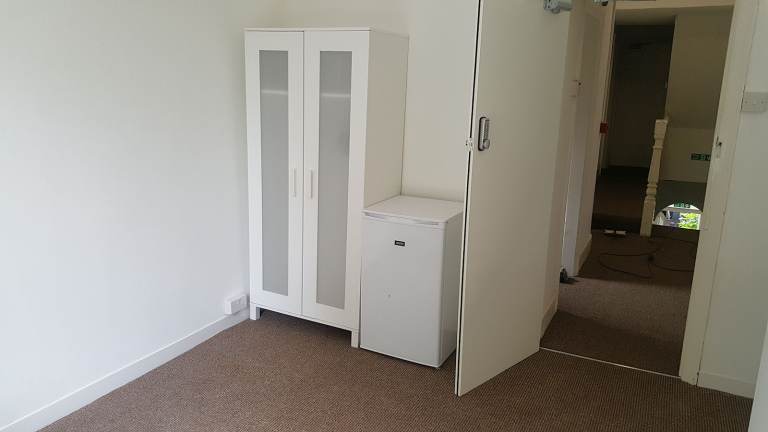 Bedroom with good quality bed, wardrobe, chest of drawers, own fridge in room and all new bedding provided.