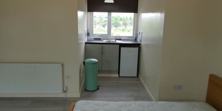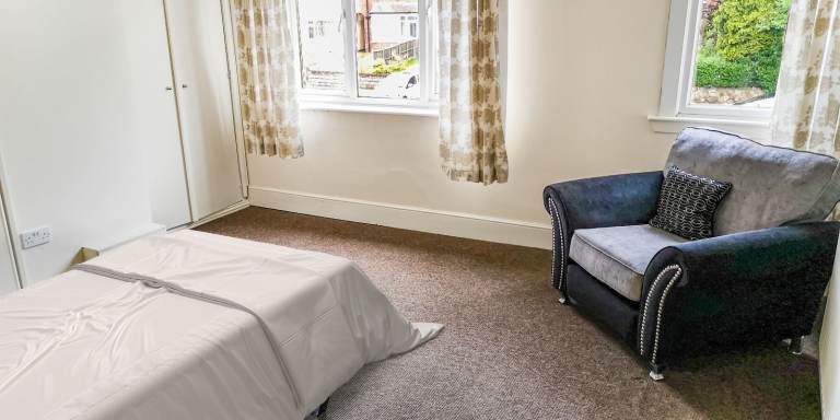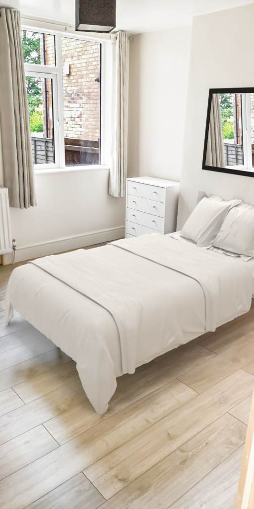 Bedroom with good quality bed, wardrobe, chest of drawers, own fridge in room and all new bedding provided.
