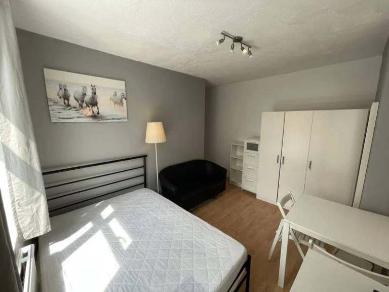There is a fully-furnished, large, double room with a private en suite bathroom in a house, in Feltham and it is available for immediate viewing. It is near the High St, the bus stop to Heathrow Airport, the bus stops to Richmond, Hounslow and Hatton Cross, and Feltham Shopping Centre.