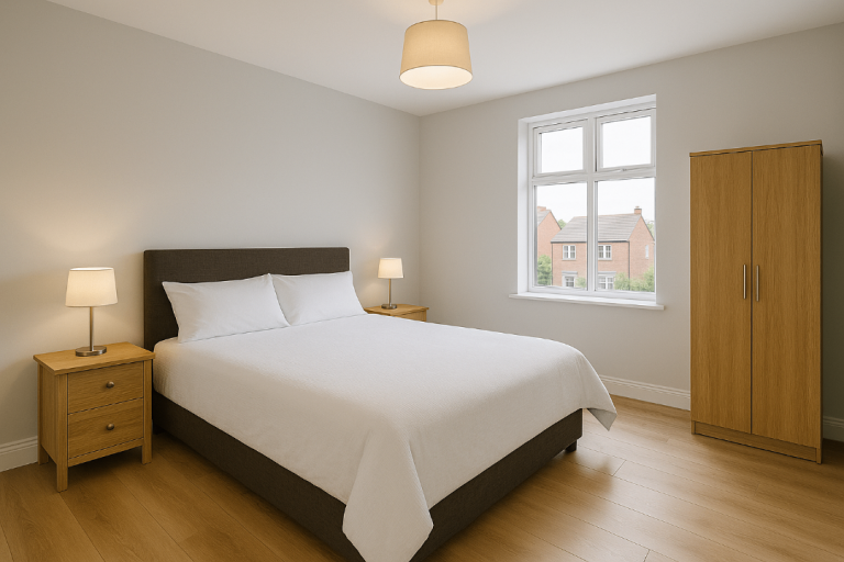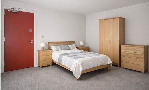 Bedroom with good quality bed, wardrobe, chest of drawers, own fridge in room and all new bedding provided.